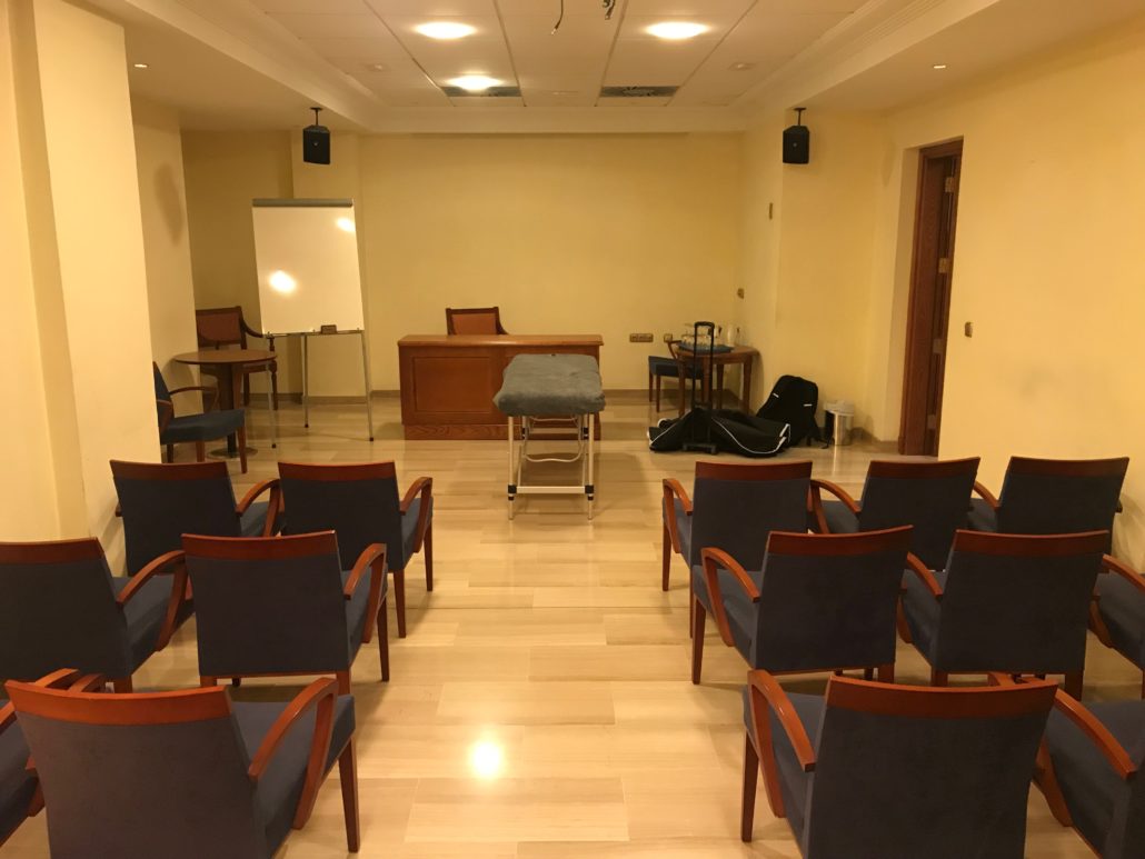De werkplek is wel even wat anders dan we gewend zijn in onze praktijk in Ede. Ik heb in het hotel mijn ‘office’ in de conferentiekamer opgesteld en op de baan zet ik de behandeltafel direct naast de atletiekbaan.
